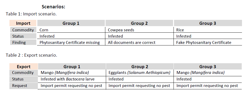 - Simulation exercises with practical demonstrations of phytosanitary inspection, sampling, pest detection and identification and decision-making.