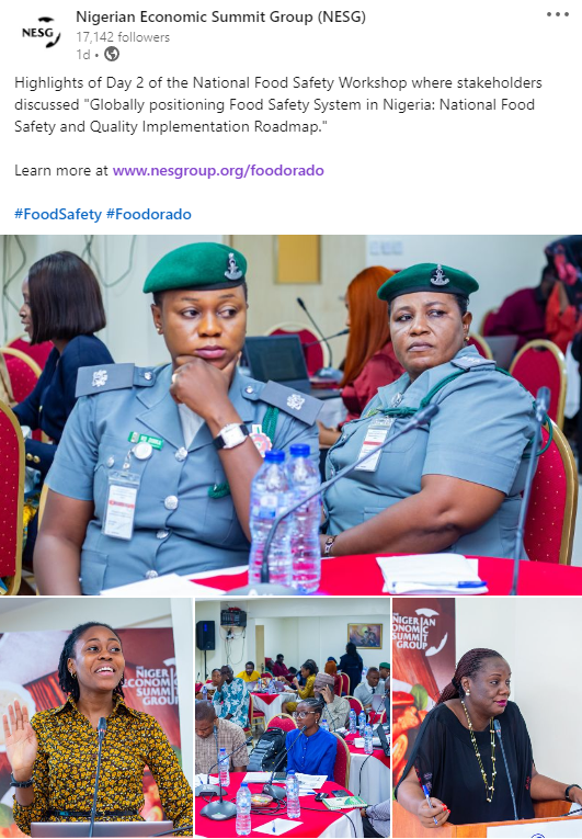 AFSI members had the honor of collaborating with the Nigeria Federal Ministry of Health, the Nigerian Economic Summit Group (NESG), USDA, and others to convene stakeholders from across Nigerian government and society for a food safety roadmap workshop. As Nigeria continues to move forward the Food Safety and Quality Bill to re-vamp its food safety system, the AFSI consortium used the workshop to share some of the U.S. experiences over the past 10+ years of implementing its own Food Safety Modernization Act (FSMA). The U.S. FSMA goals of “shifting from responding to foodborne illness to preventing it,” uses risk-based approaches to enact shared responsibility among actors throughout the global food supply chain to ensure safe food. It also demonstrates the need for ongoing coordination across levels and sectors of government.