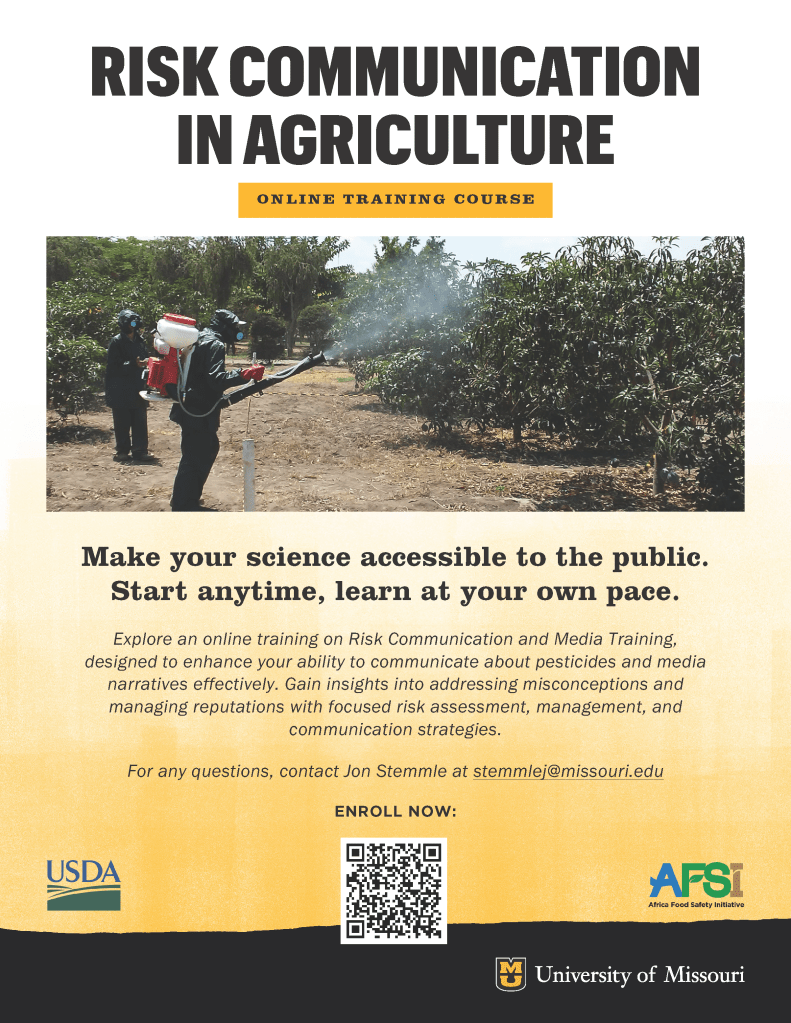 Thanks to the support of USDA, faculty from the University of Missouri’s School of Journalism have developed a free online training course on Risk Communication, designed specifically for people who work in plant health regulatory capacities in Africa, but with lessons that are useful for public sector and researchers worldwide.